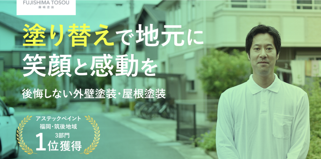 藤嶋塗装は、福岡市に隣接する春日市を拠点に、福岡都市圏で活動する塗装店です。「塗り替えで地元に笑顔と感動を」を掲げ、代表の藤嶋氏と熟練職人が真面目な仕事を提供しています。